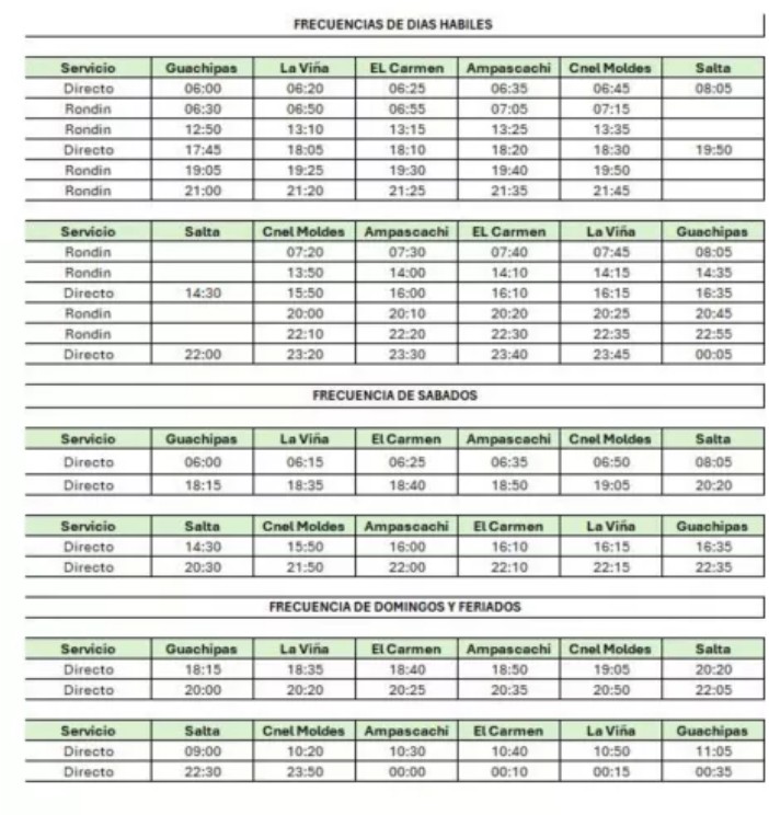Para hoy se contemplarán 3 frecuencias directas y 3 rondines que saldrán desde Guachipas, continuarán por La Viña, El Carmen, Ampascachi, Coronel Moldes para culminar en Salta.